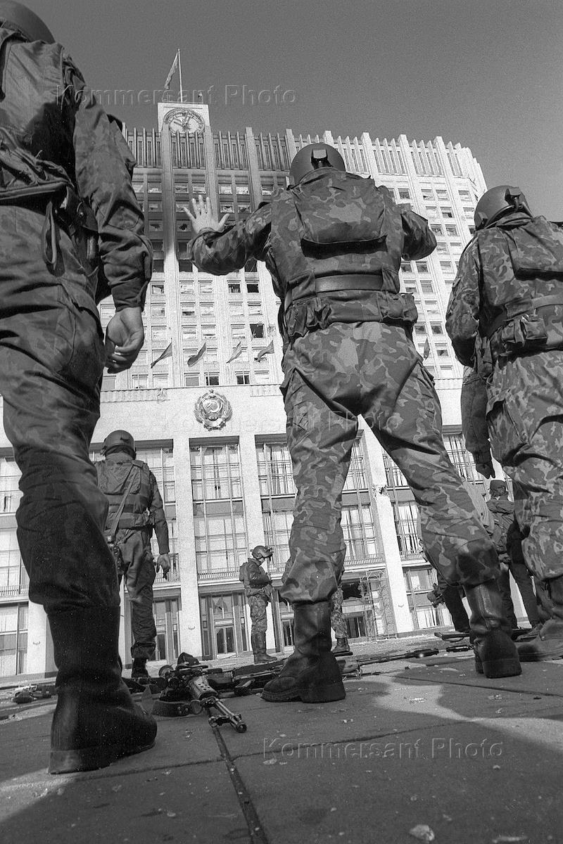 Бойцы ОМОНа у обстрелянного здания Белого Дома во время октябрьских событий 1993 года - попытки государственного переворота, расстрела здания Верховного Совета России.