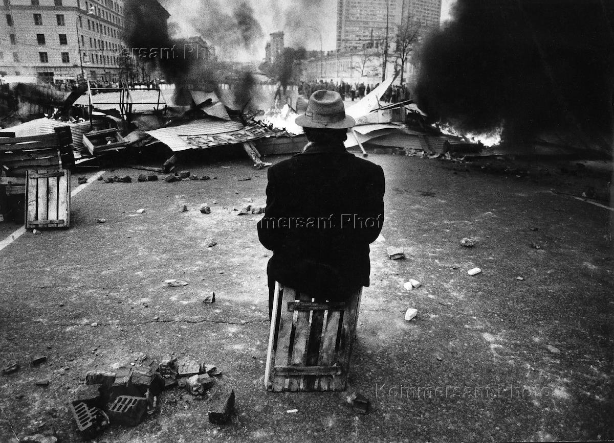Старик сидит на ящике перед горящей баррикадой во время октябрьских событий 1993 года - попытки государственного переворота, расстрела здания Верховного Совета России.