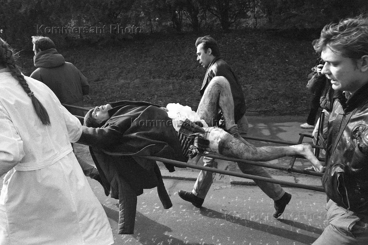 Осада Белого во время октябрьских событий 1993 года - попытки государственного переворота, расстрела здания Верховного Совета России. Медицинские работники оказывают помощь людям, пострадавшим во время Октябрьского путча.