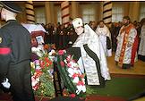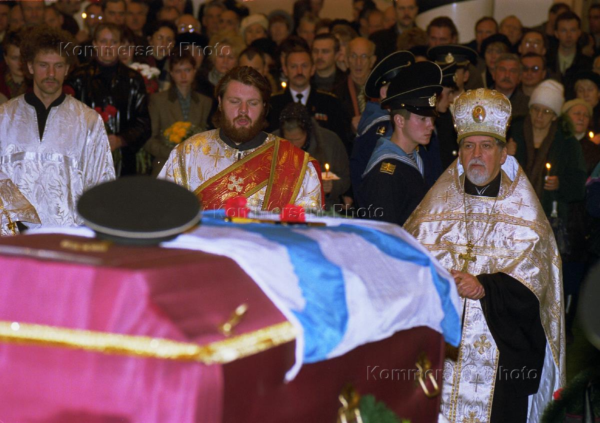 Отпевание капитан-лейтенанта Дмитрия Колесникова - первого из опознанных членов экипажа атомной подводной лодки "Курск", состоялось в актовом зале Высшего военно-морского училища имени Дзержинского, которое в 1995 году закончил Дмитрий. Справа настоятель Морского Кафедрального Николо-Богоявленского собора отец Богдан.