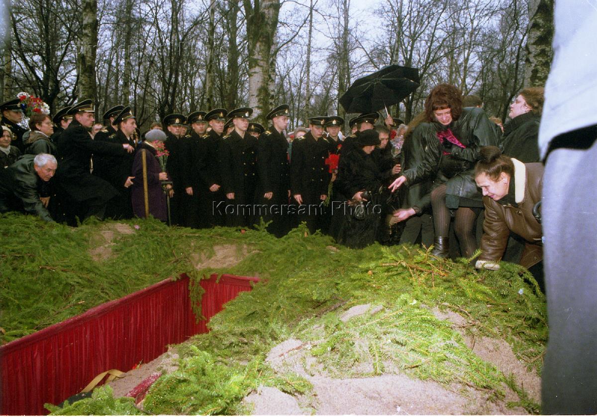 Похороны капитан-лейтенанта Дмитрия Колесникова - первого из опознанных членов экипажа атомной подводной лодки "Курск" на Серафимовском кладбище. У могилы Дмитрия командующий Северным флотом Вячеслав Попов (второй слева) и губернатор Санкт-Петербурга Владимир Яковлев (в центре с цветами).