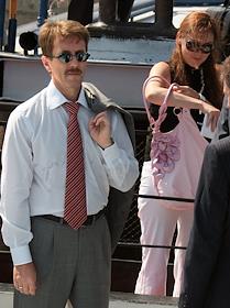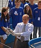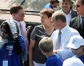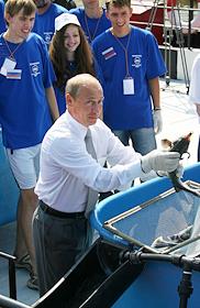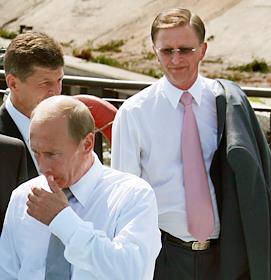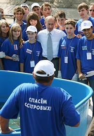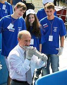 Президент России Владимир Путин (третий справа),первый заместитель председателя Правительства России Сергей Иванов (второй слева), заместитель министра по делам печати России Владимир Григорьев (второй справа) и директор Астраханского научно-производственного центра по осетроводству "БИОС" Лидия Васильева (в центре) во время во время посещения Центра "БИОС".