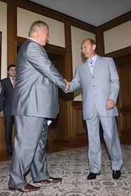 Президент России Владимир Путин (справа) во время встречи с председателем федерации независимых профсоюзов России Михаилом Шмаковым (слева) в резиденции Президента России "Бочаров ручей".