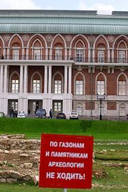 Государственный музей-заповедник "Царицыно" после реставрации. Табличка с надписью "По газонам и памятникам археологии не ходить!".