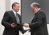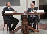 Председатель правления "Сбербанка России" Андрей Казьмин (слева) и председатель Центральной избирательной комиссии России Владимир Чуров (справа) во время подписания договоров о взаимодействии в период избирательной компании в рамках соглашения между Центризбиркомом России и Сбербанком России. Церемония подписания прошла в Центризбиркоме.