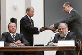 Председатель правления "Сбербанка России" Андрей Казьмин (слева) и председатель Центральной избирательной комиссии России Владимир Чуров (второй справа) во время подписания договоров о взаимодействии в период избирательной компании в рамках соглашения между Центризбиркомом России и Сбербанком России. Церемония подписания прошла в Центризбиркоме.