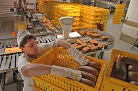 Работница в цехе отгрузки во время укладки готовой продукциих на предприятии хлебопекарной промышленности ОАО "Каравай".