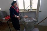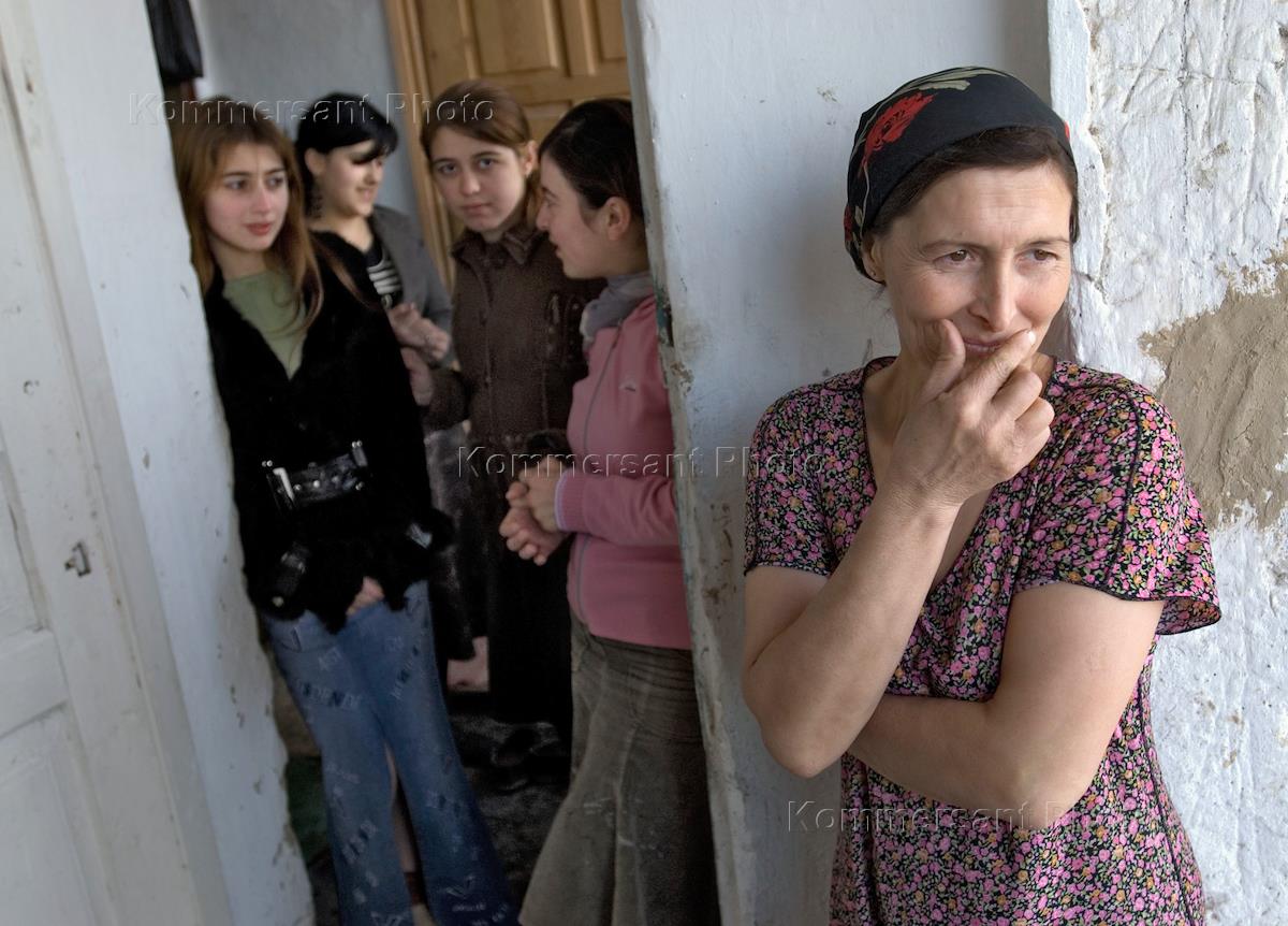 Беженцы из Чечни в селе Хасавюрт. Женщина растапливает печку в доме.