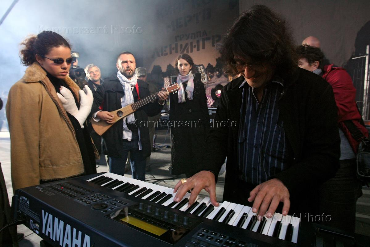 Лидер группы "Ленинград" Сергей Шнуров (второй слева) и альтист, художественный руководитель камерного оркестра "Солисты Москвы" Юрий Башмет (справа) во время окончания съемки фильма "2 АССА 2" в Зеленом театре ЦПКиО имени Горького.