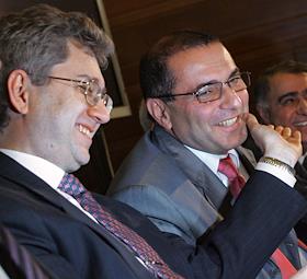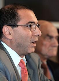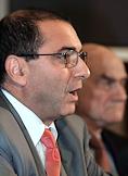 Президент Ассоциации Банков России Гарегин Тосунян (слева) и экономист, научный руководитель Государственного Университета "Высшая школа экономики" Евгений Ясин (справа) во время пресс-конференции на тему: "Банковская система России и колебания на международном финансовом рынке: существует ли опасность кризиса?". Пресс-конференция прошла в агентстве "ИТАР-ТАСС".