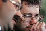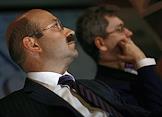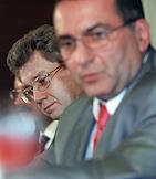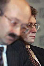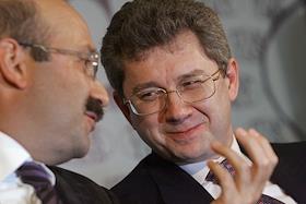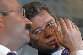 Заместитель председателя Центрального Банка России Константин Корищенко (справа) и президент - председатель правления ЗАО "Внешторгбанк Розничные услуги" Михаил Задорнов (слева) на пресс-конференции на тему: "Банковская система России и колебания на международном финансовом рынке: существует ли опасность кризиса?". Пресс-конференция прошла в агентстве "ИТАР-ТАСС".