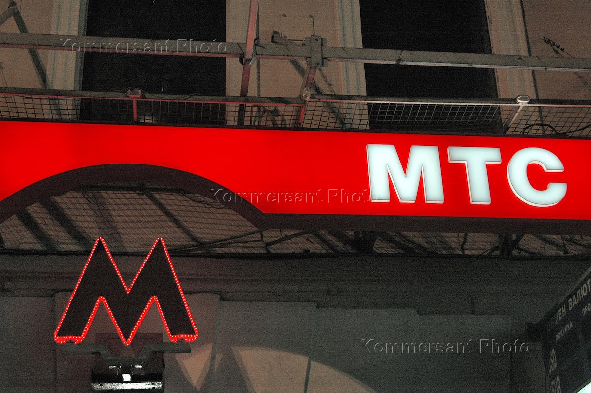 Световая реклама оператора сотовой связи "МТС" у входа в метро.