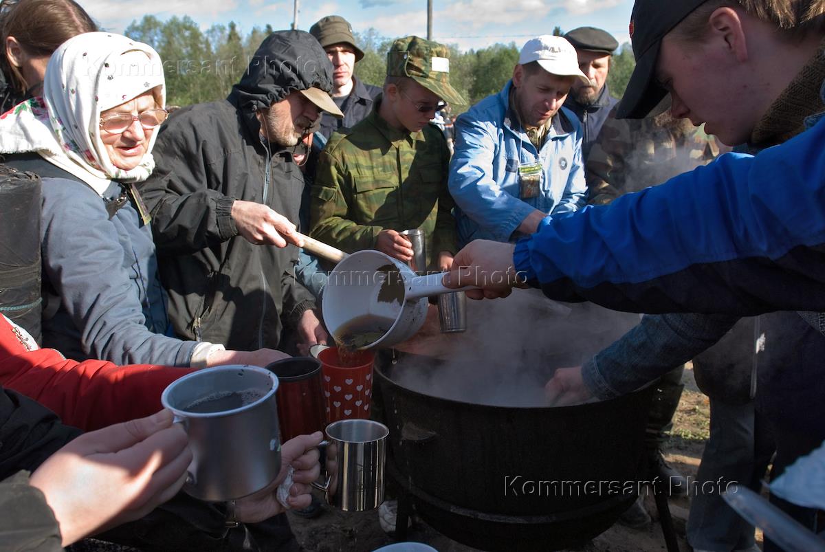 Участники Всероссийского Великорецкого Крестного хода, в местности между городом Вяткой и селом Великорецким во время обеда. Крестный ход начался 3 июня из Свято-Серафимовского собора.
