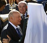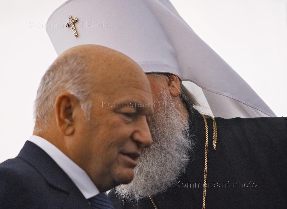 Мэр Москвы Юрий Лужков (слева), первый заместитель мэра Москвы в правительстве Москвы, руководитель комплекса архитектуры, строительства, развития и реконструкции города Москвы Владимир Ресин (в центре) и управляющий делами Московской Патриархии митрополит Калужский и Боровский Климент (справа) на церемонии закладки камня в основание башни "Россия", которая станет самым высоким сооружением в Европе.