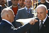 Мэр Москвы Юрий Лужков (слева) и генеральный директор компании "СТ Девелопмент" Шалва Чигиринский (справа) на церемонии закладки камня в основание башни "Россия", которая станет самым высоким сооружением в Европе.