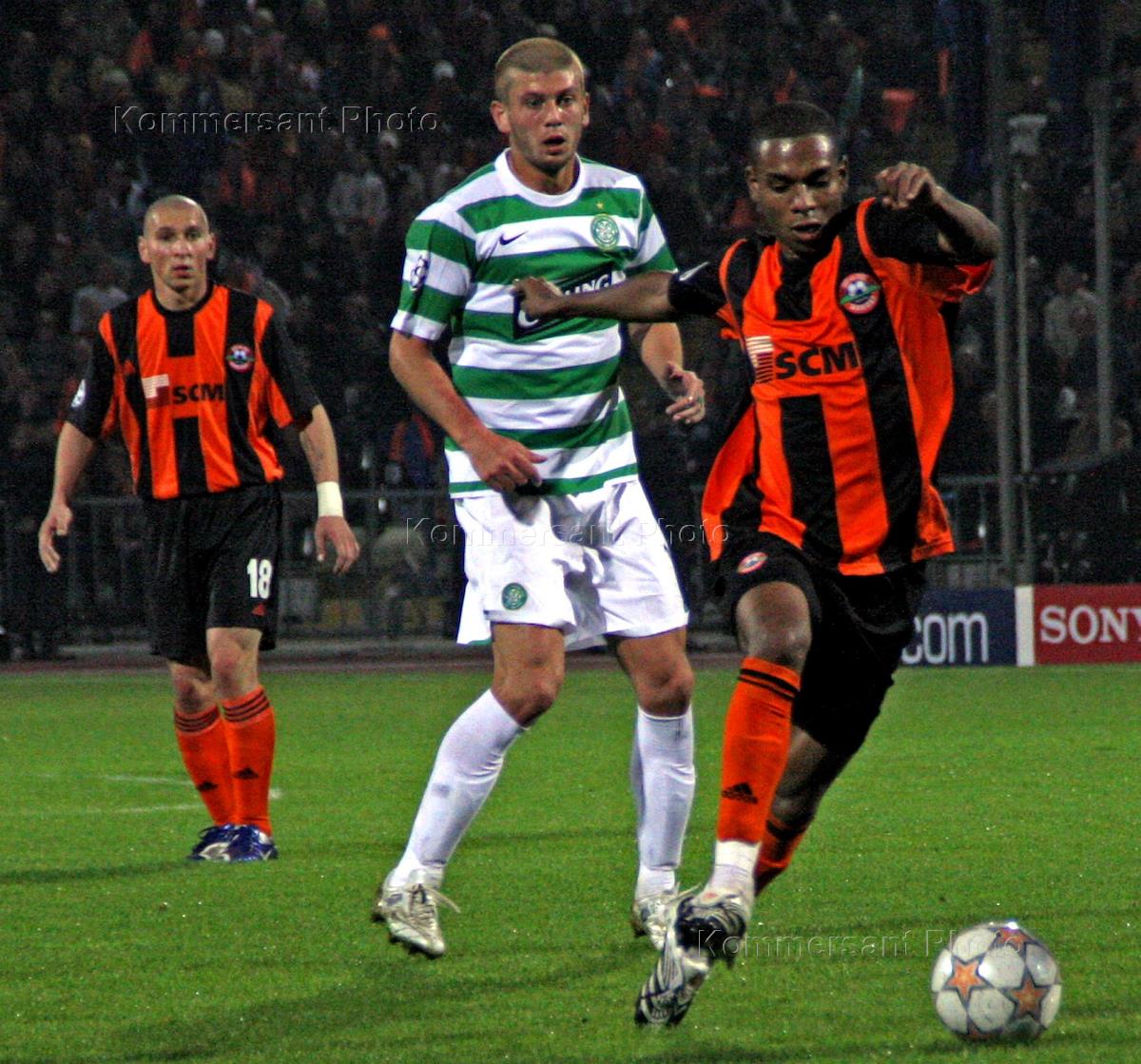 Игрок Шахтера Кристиано Лукарелли (в центре) в матче группового этапа Лиги чемпионов между командами "Шахтер" (Донецк) и "Селтик" (Глазго, Шотландия).