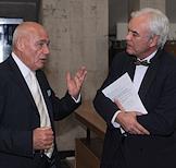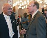 Президент Академии российского телевидения, телеведущий Владимир Познер (слева) и телеведущий Владимир Молчанов (справа) на церемонии вручения Национальной телевизионной премии "ТЭФИ - 2007". Церемония награждения победителей в категории "Профессии" прошла в ГЦКЗ "Россия" в Лужниках.