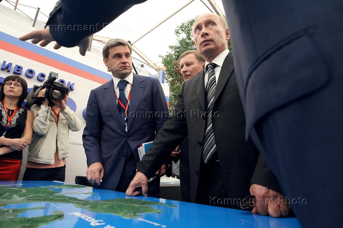 Губернатор Приморского края Сергей Дарькин (в центре), Президент России Владимир Путин (справа) и исполняющий обязанности первого заместителя председателя Правительства России Сергей Иванов (второй справа) во время VI Международного инвестиционного форума.