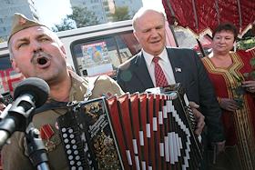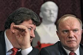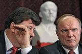 Лидер Коммунистической партии России (КПРФ), член Совета Государственной Думы Геннадий Зюганов (справа) и его заместитель Владимир Кашин (слева) на XII (внеочередном) съезде "Коммунистической партии Российской Федерации", на котором был утвержден избирательный список коммунистов для выборов в Госдуму. Съезд прошел в учебном центре профсоюзов АПК в поселке Московский.