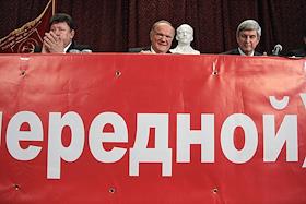 Лидер Коммунистической партии России (КПРФ), член Совета Государственной Думы Геннадий Зюганов (в центре), его заместитель Владимир Кашин (слева) и член Комитета Государственной Думы России по образованию и науке Иван Мельников (справа) на XII (внеочередном) съезде "Коммунистической партии Российской Федерации", на котором был утвержден избирательный список коммунистов для выборов в Госдуму. Съезд прошел в учебном центре профсоюзов АПК в поселке Московский.