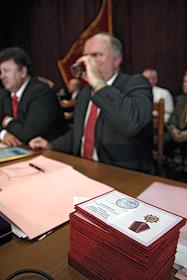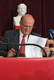 Лидер Коммунистической партии России (КПРФ), член Совета Государственной Думы Геннадий Зюганов (справа) на XII (внеочередном) съезде "Коммунистической партии Российской Федерации", на котором был утвержден избирательный список коммунистов для выборов в Госдуму. Съезд прошел в учебном центре профсоюзов АПК в поселке Московский. На столе лежат документы на награждение орденом "Партийная доблесть".