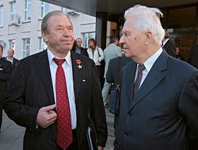 Председатель Аграрной партии России Василий Стародубцев (слева) и бывший член Политбюро ЦК КПСС Егор Лигачев (справа) на XII (внеочередном) съезде "Коммунистической партии Российской Федерации", на котором был утвержден избирательный список коммунистов для выборов в Госдуму. Съезд прошел в учебном центре профсоюзов АПК в поселке Московский.
