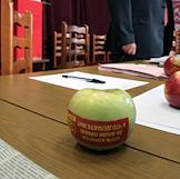 XII (внеочередной) съезд "Коммунистической партии Российской Федерации", на котором был утвержден избирательный список коммунистов для выборов в Госдуму прошел в учебном центре профсоюзов АПК в поселке Московский. Яблоко с политическим лозунгом на столе президиума.