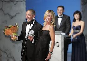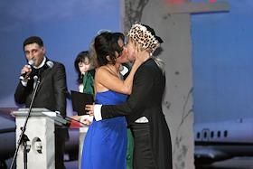 Ресторатор Аркадий Новиков (слева) и главный редактор русской версии журнала "Vogue" Алена Долецкая (вторая слева) на церемонии вручения премии "Человек года" журнала "GQ". Церемония прошла в театре "Et Cetera".