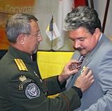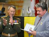 Лидер партии национального возрождения "Народная воля - Социалистическая единая партия России", депутат Государственной Думы России Сергей Бабурин (слева) и член фракции "Родина" в Государственной Думе России Виктор Алкснис (справа) на VIII съезде политической партии "Народный союз" в гостиничном комплексе "Измайлово".