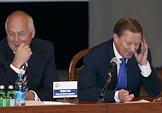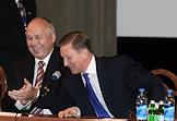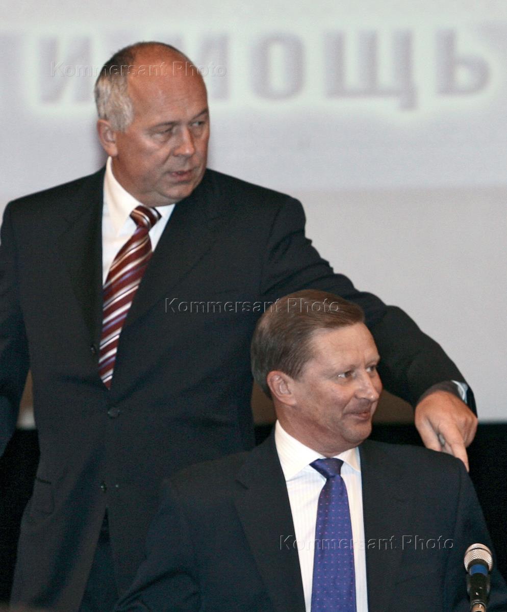 Генеральный директор Федерального государственного унитарного предприятия "Рособоронэкспорт" Сергей Чемезов (слева) и первый заместитель председателя Правительства России Сергей Иванов (справа) во время заседания первой всероссийской научно-практической конференции "Актуальные проблемы машиностроения России". Конференция прошла во Дворце культуры МГТУ имени Н.Э.Баумана.