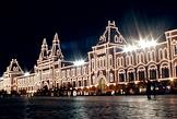 Здание магазина ГУМ в ночном освещении.