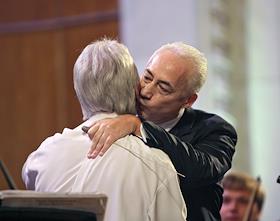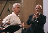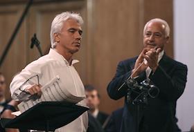 Певец Дмитрий Хворостовский (слева) и президент Московского Международного Дома музыки (ММДМ), дирижер Владимир Спиваков (справа) во время концерта в рамках проведения IV-ого Международного фестиваля "Владимир Спиваков приглашает". Концерт прошел в Большом зале консерватории.