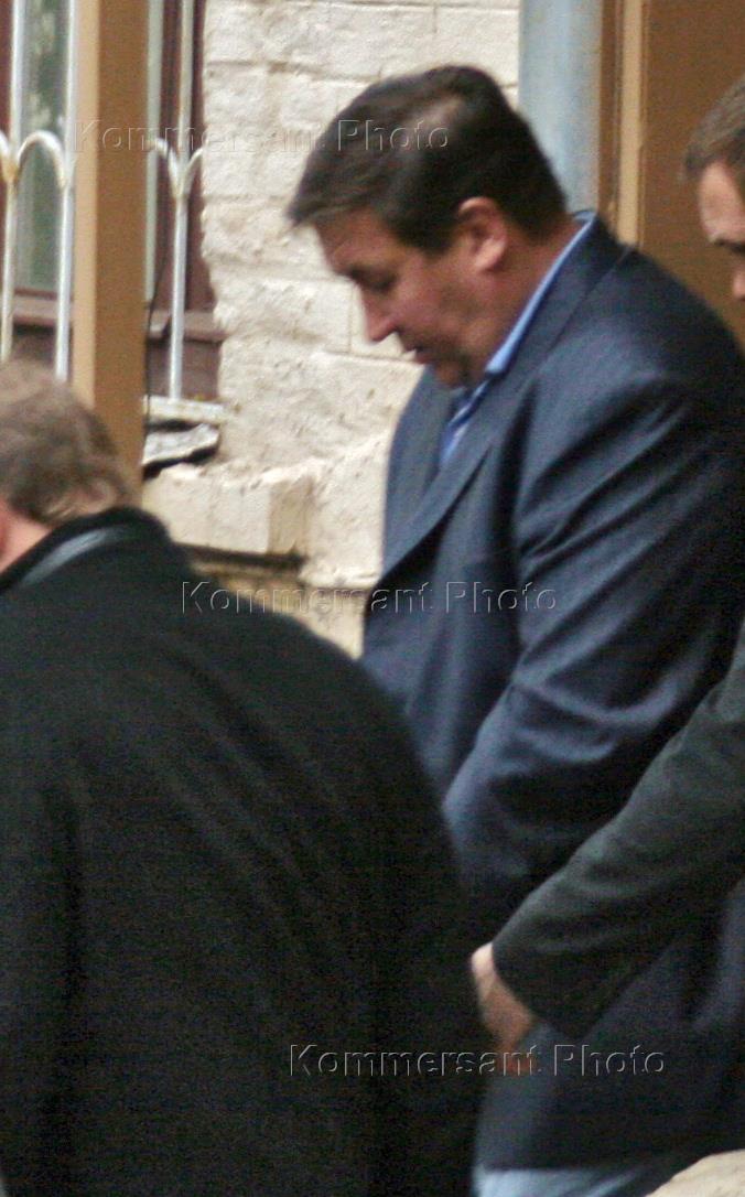 Начальник Департамента федеральной службы по контролю за оборотом наркотиков, генерал-лейтенант Александр Бульбов (в центре) после окончания заседания Басманного суда. Бульбова обвиняют в злоупотреблении служебным положением, превышении должностных полномочий, незаконной предпринимательской деятельностью, незаконном прослушивании телефонных переговоров и получение взятки.