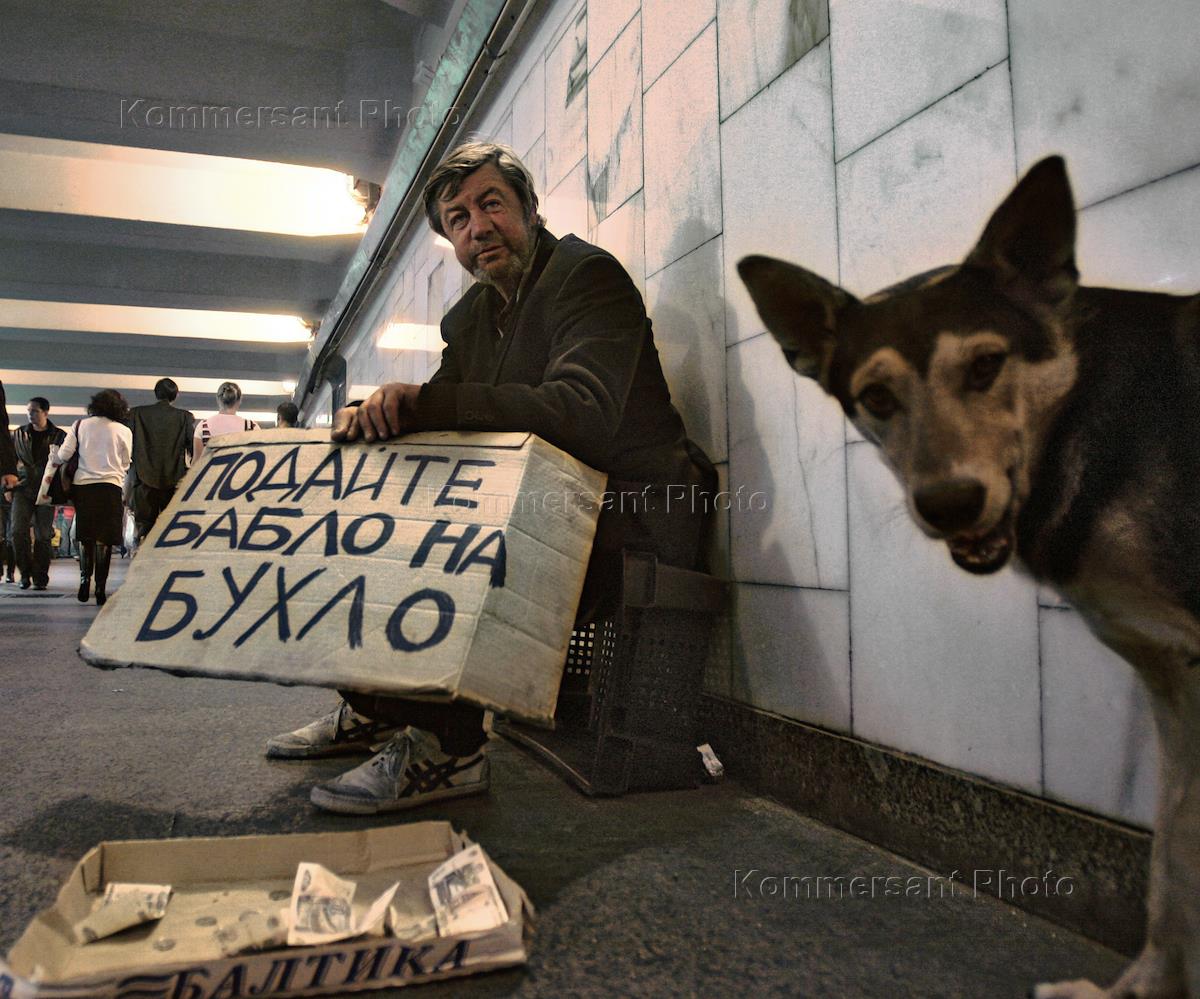 Мужчина с дворовой собакой попрошайничают в подземном переходе на Проспекте Мира. Табличка с надписью "Подайте бабло на бухло".