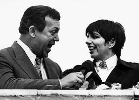 Российский певец Иосиф Кобзон (слева) и американская певица Лайза Минелли (справа) выступают перед солдатами на трибуне в Таманской дивизии.
