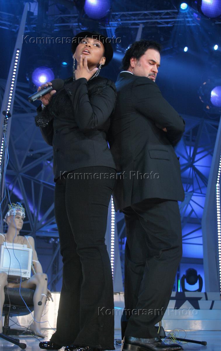Участница телепроекта "Фабрика звезд - 7" Корнелия Манго (слева) и певец Валерий Меладзе (справа) на отчетном концерте телепроекта "Фабрика звезд - 7" в телестудии Останкино.