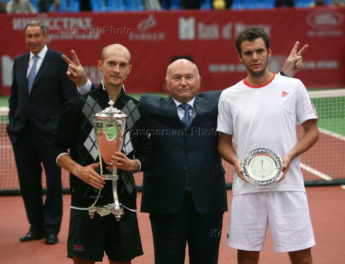Главный тренер сборной России по теннису Шамиль тарпищев (слева), российский теннисист Николай Давыденко (второй слева), мэр Москвы Юрий Лужков (в центре) и французский теннисист Поль-Анри Матье (справа) после окончания игры в финале XVIII Международного теннисного турнира "Кубок Кремля - 2007" в спортивном комплексе "Олимпийский". Давыденко выиграл у французского теннисиста Поля-Анри Матье.