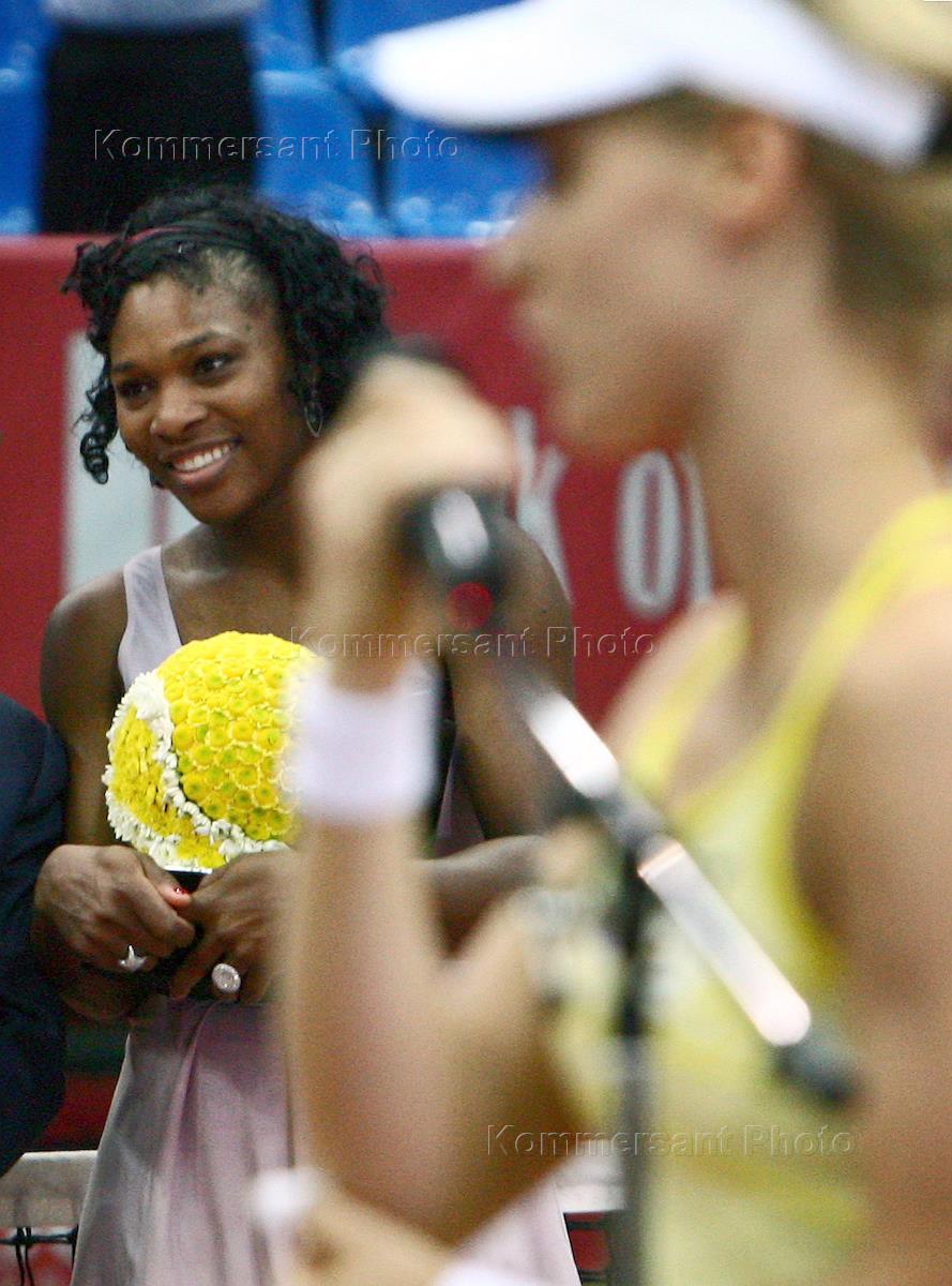 XVIII Международный теннисный турнир "Кубок Кремля" - 2007 в спортивном комплексе "Олимпийский". Финал. Американская теннисистка Серена Уильямс (слева) во церемонии награждения победителей турнира среди женщин.