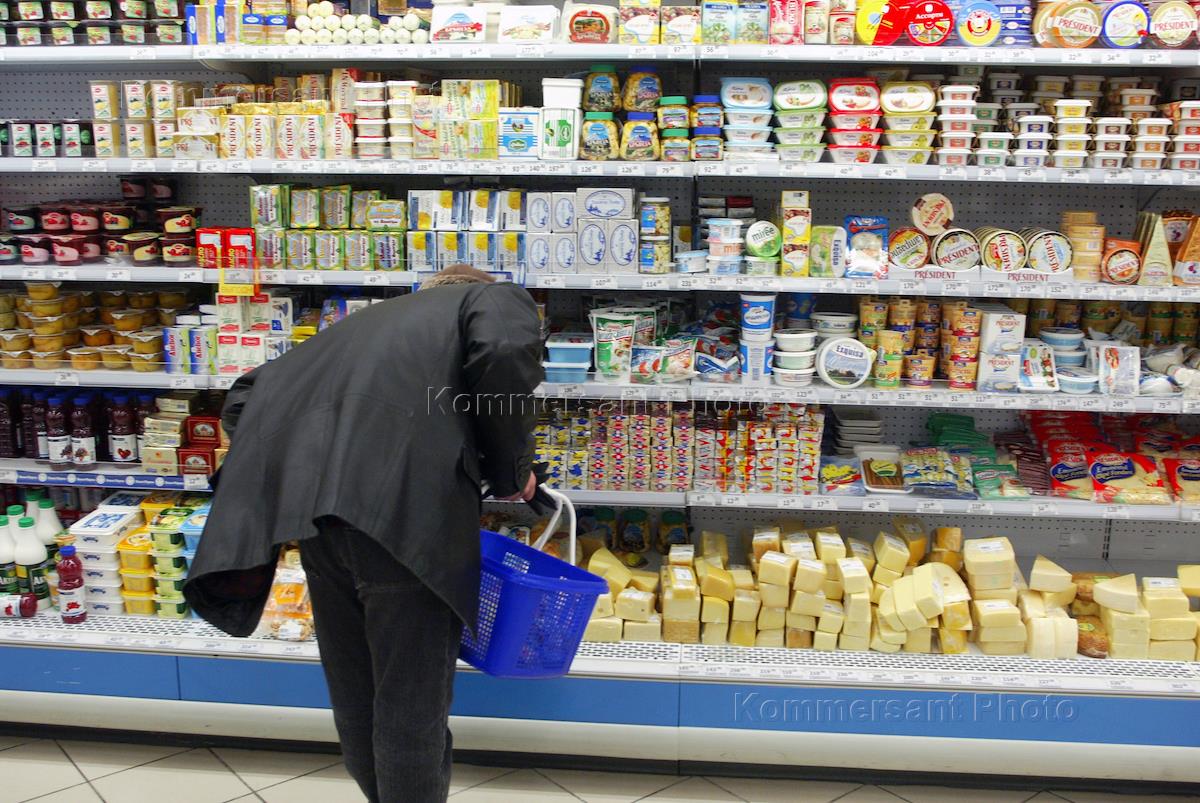 Покупатель перед прилавком сыров в торговом зале супермаркета "Перекресток".