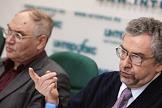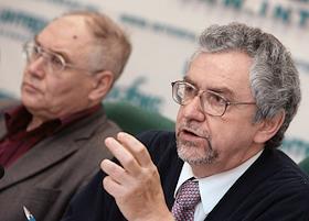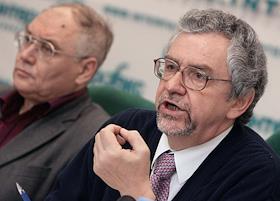 Директор "Левада - Центра" Лев Гудков (слева) и руководитель отдела социально-политических исследований "Левада - Центра" Борис Дубин (справа) на пресс-конференции "Выборы в Госдуму: настроения россиян". Пресс-конференция прошла в агентстве "Интерфакс".