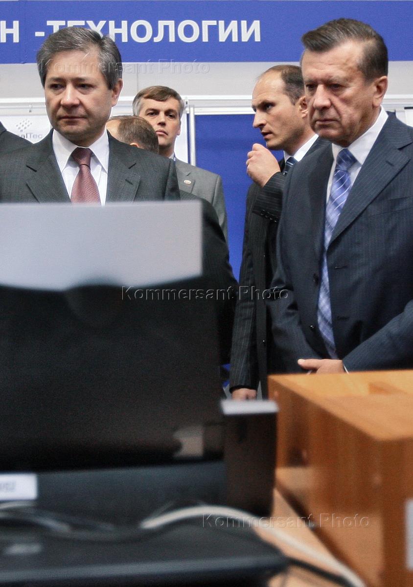 Министр информационных технологий и связи России Леонид Рейман (слева) и председатель Правительства России Виктор Зубков (в центре) на церемонии открытия Международной выставки "Инфоком - 2007" в выставочном центре "Крокус Экспо".