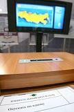 Международная выставка "Инфоком - 2007" открылась в выставочном центре "Крокус Экспо". Рабочий с уборочной техникой на фоне стенда оператора сотовой связи "Мегафон".