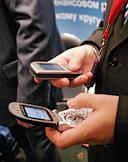 Участник IV-ого Федерального инвестиционного форума с двумя мобильными телефонами в руке в зале заседаний. Форум прошел в отеле "Рэдиссон САС Славянская".