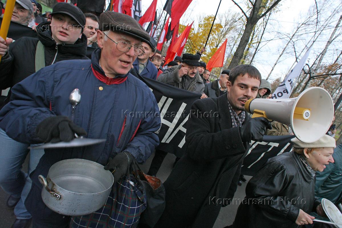 "Марш против бедности" он же "Марш пустых кастрюль", организованный запрещенной лимоновской Национал-большевистской партией (НБП) и Обьединенным гражданским фронтом (ОГФ). Участники акции прошли от станции метро "Горьковская" к Петропавловской крепости, где состоялся митинг. Лидер НБП в Санкт-Петербурге Андрей Дмитриев (справа) на митинге.