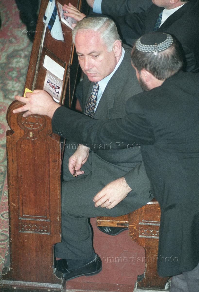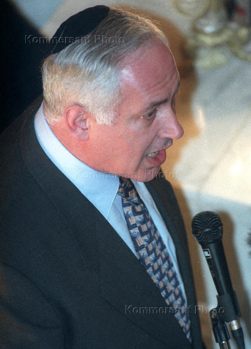 Президент Российско-Еврейского Конгресса, глава холдинга "Медиа-Мост" Владимир Гусинский приветствует премьер-министра Израиля Беньямина Нетаньяху во время его приезда в московскую хоральную синагогу для встречи с еврейской общиной.