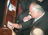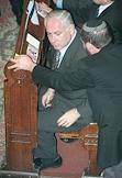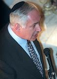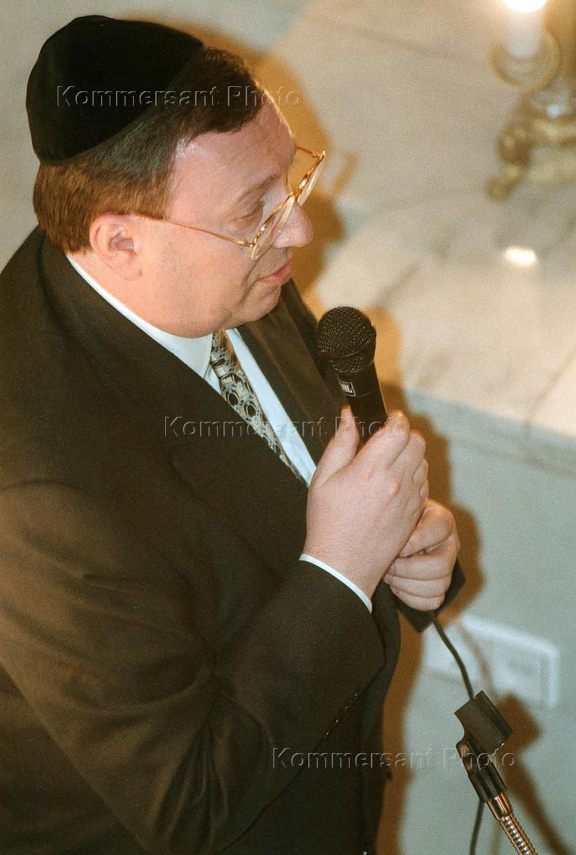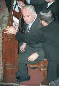 Президент Российско-Еврейского Конгресса, глава холдинга "Медиа-Мост" Владимир Гусинский приветствует премьер-министра Израиля Беньямина Нетаньяху во время его приезда в московскую хоральную синагогу для встречи с еврейской общиной.
