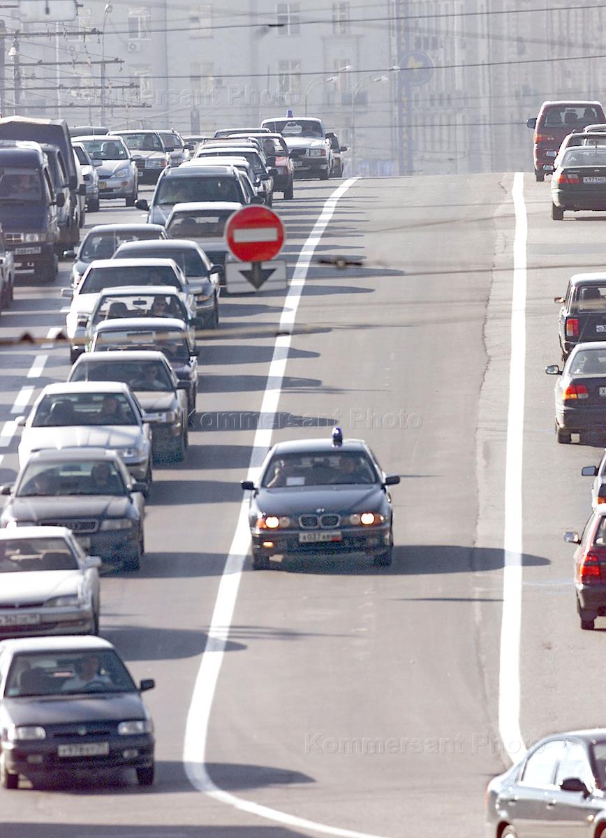 Правительственная машина "Волга", которая едет по разделительной полосе по Каменному мосту.