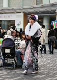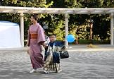 Женщина и ребенок в национальных японских костюмах в городском парке.