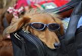 Такса в солнцезащитный очках сидит в дорожной сумке.