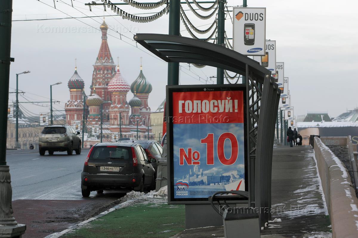 Предвыборный плакат партии "Единая Россия" "Голосуй! № 10" на фоне Покровского собора (храма Василия Блаженного).